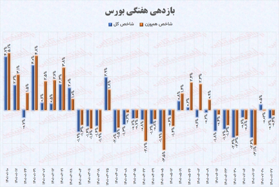 شاخص هموزن این هفته هم بازدهی منفی را ثبت کرد تا در ۷ هفته متوالی گذشته و از اواسط شهریور شاخص هم وزن به طور هفتگی همواره در حال کاهش باشد.