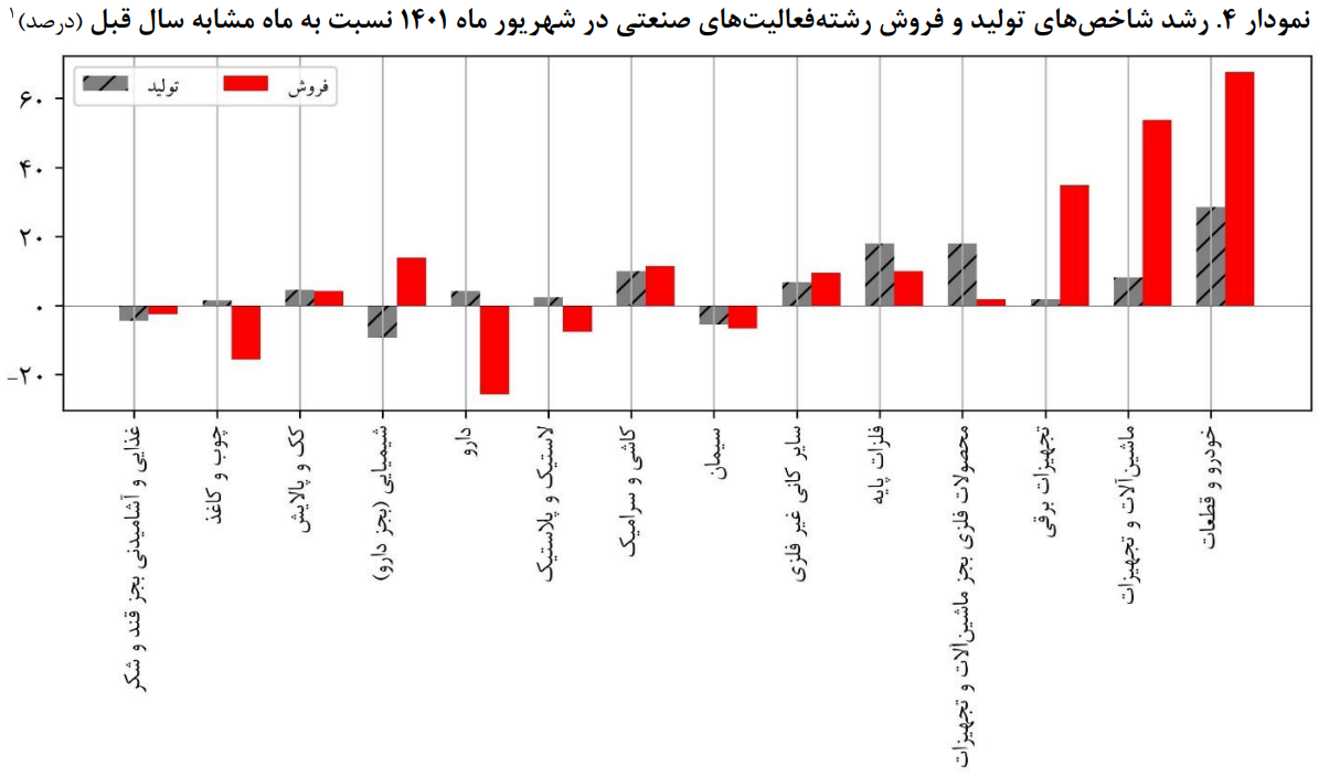 همچنین در شهریور ماه ۱۴۰۱ نسبت به ماه قبل، از بین ۱۵ رشته فعالیت صنعتی بورسی رشته فعالیت های «خودرو و قطعات»، «غذایی و آشامیدنی بجز قند و شکر» و «فلزات پایه» بیشترین سهم را در افزایش شاخص تولید و رشته فعالیت های «شیمیایی (بجز دارو)» و «محصولات فلزی بجز ماشین آلات و تجهیزات» بیشترین سهم را در کاهش شاخص تولید داشته اند.